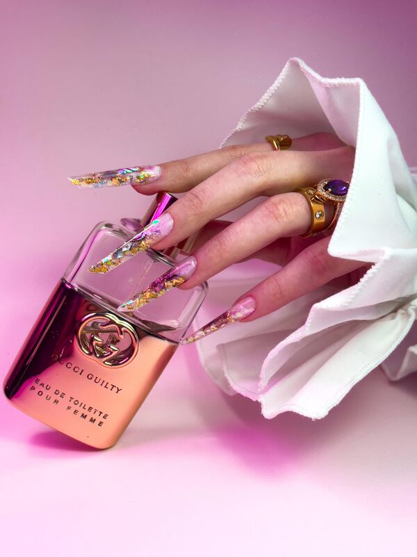 The participant should extend nails using dual forms on one hand with inside sculptured design.